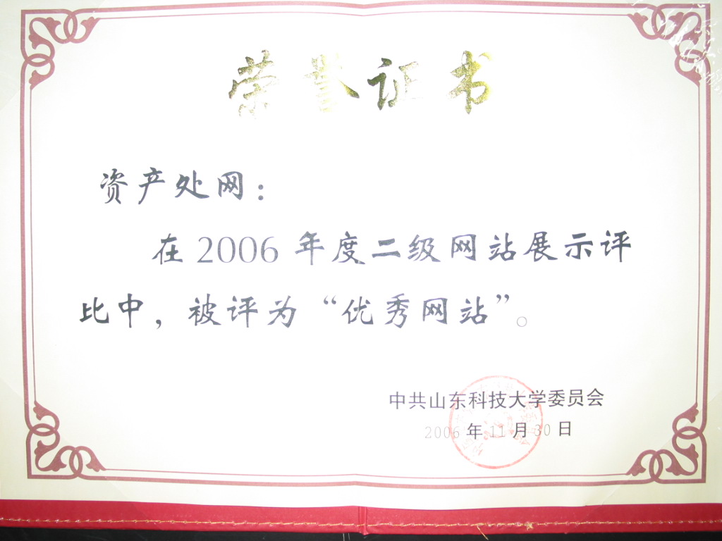 ,学校召开二级网站总结表彰大会,资产网被评为2006年度山东科技大学“优秀网站”。