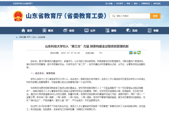 相关链接:山东科技大学引入“第三方”力量 探索构建全过程项目管理机制(山东省教育厅网站:http://edu.shandong.gov.cn/art/2022/7/7/art_11972_10302282.html)