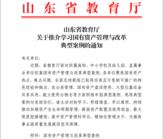近日,我校撰写的《国有资产统筹盘活典型案例》获得山东省教育厅认可,并在全省教育系统范围内推介学习。
